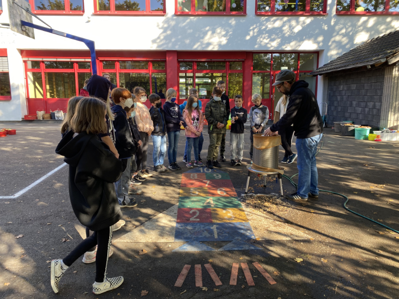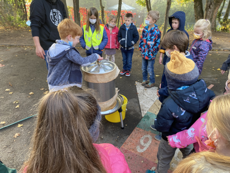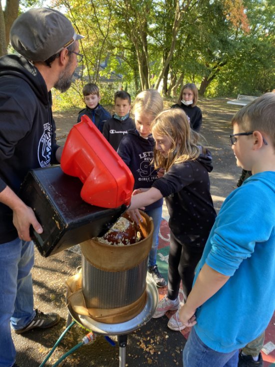 Freitags morgens wurde dann auf dem Schulhof an verschiedenen Stationen eine Art Parcours zur Herstellung von Apfelsaft aufgebaut und nacheinander durften die einzelnen Klassen ihren eigenen Saft pressen.