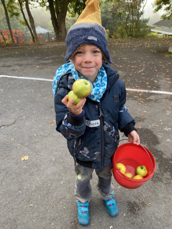 Angefangen mit einer Waschstation, an der die Kinder die mitgebrachten Äpfel in großen Eimern mit ebenso großen Sieben waschen mussten, ging es auf die Reise.
