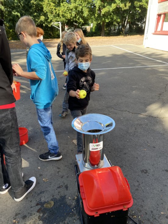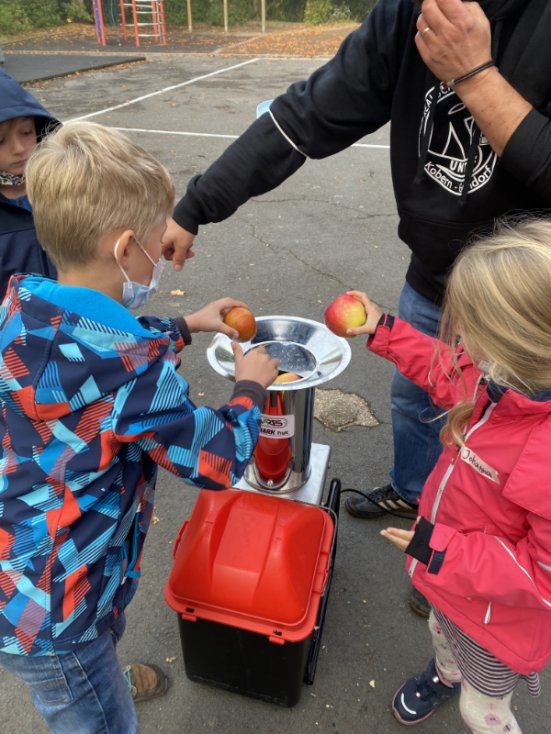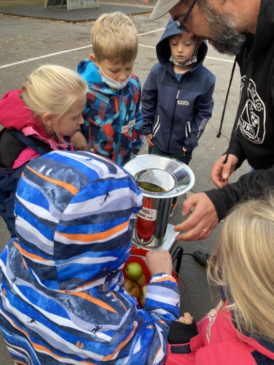 Am letzten Tag vor den Herbstferien war es so weit. Wir durften auf unserem Schulhof eigenen Apfelsaft pressen. Bereits im Vorfeld ging das fleißige Sammeln der benötigten Äpfel los. Am Mittwoch und Donnerstag brachten aufgeregte Kinder mit ihren Eltern die gesammelten Äpfel in die Schule, sodass im Flur ein reinstes Apfelparadies entstand.